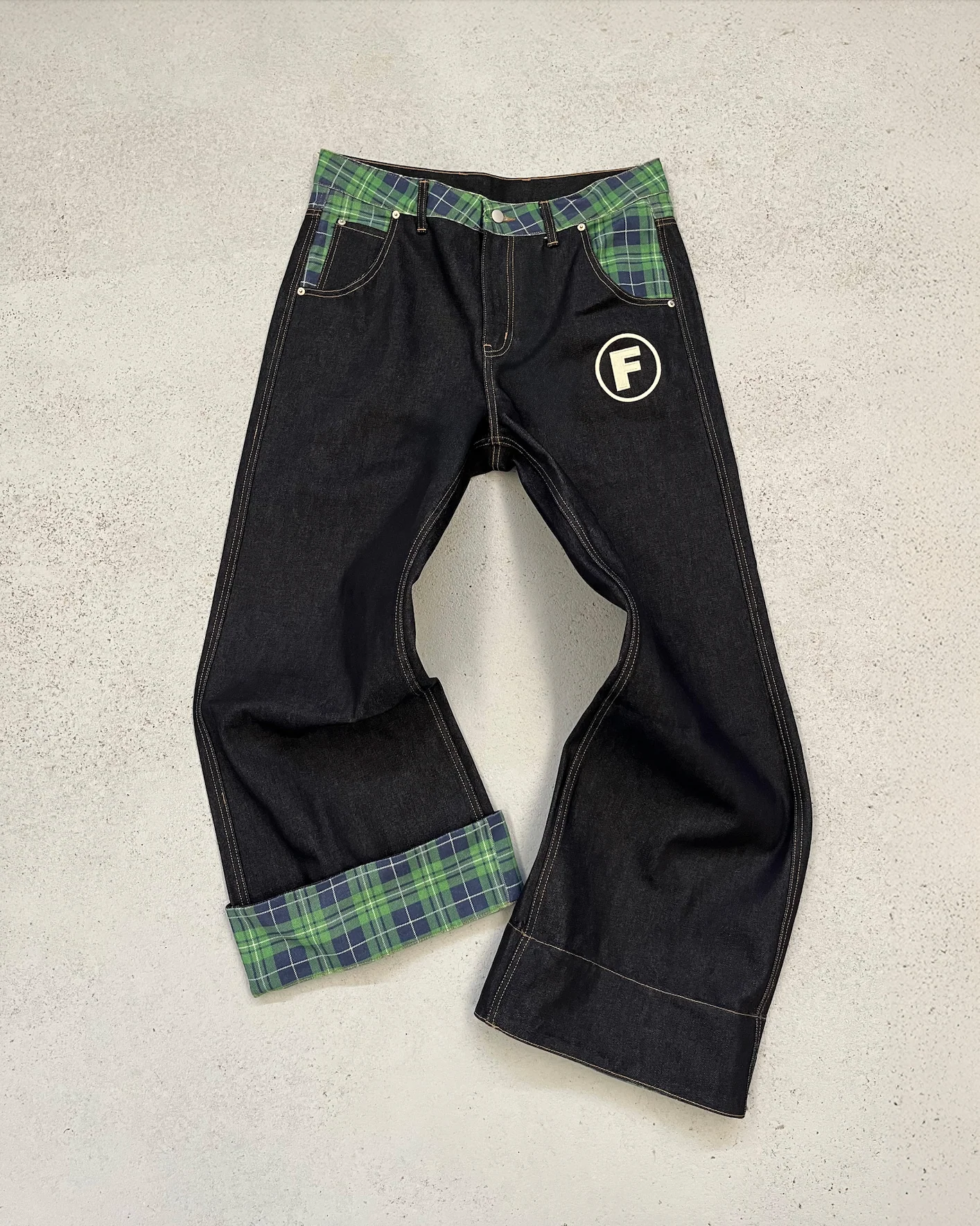 These wide denim jeans feature deep navy construction with standout green tartan lining, designed to show off when cuffed. A contrast plaid pocket and signature “F” patch add a playful edge.