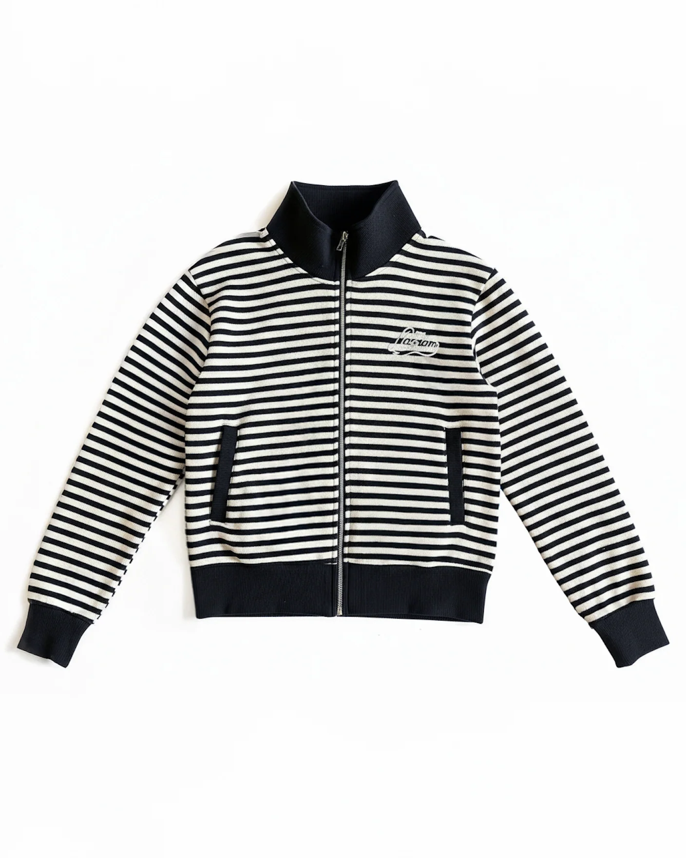 This striped zip-up top blends a sporty edge with everyday comfort. Designed with a relaxed fit, ribbed cuffs, and hem for a snug finish, itās perfect for layering or wearing on its own. A small embroidered logo on the chest adds a subtle branded touch. Style it separately for a casual vibe or pair with the matching pants for a coordinated look.